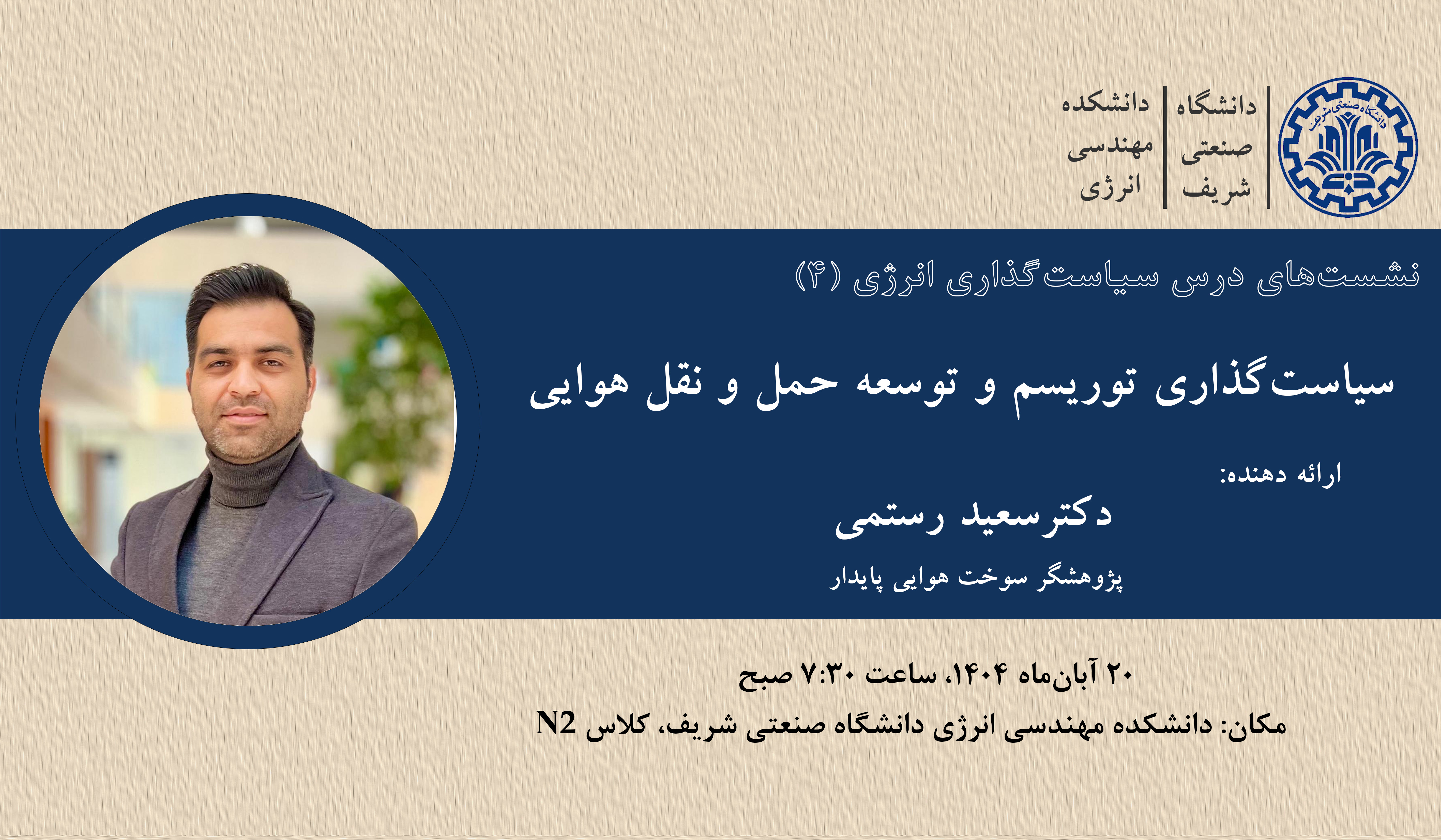 دانشکده مهندسی انرژی برگزار می کند، نشست درس سیاستگذاری انرژی(4): سیاستگذاری توریسم و توسعه حمل و نقل هوایی